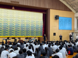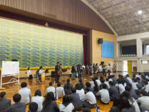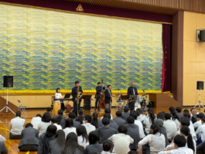 トップNEWS中高共通授業参観・育友会後期研修会がありました 2025.11.17 中高共通 授業参観・育友会後期研修会がありました 11月17日(月)の午後に授業参観および育友会後期研修会がありました。 授業参観では、中学生の探究発表や高校生の授業を保護者の方々に参観いただきました。 授業参観後に行われた育友会後期研修会では、蒼開中学校・高等学校ジャズバンド部の講師の方々を中心に結成されたバンドによるジャズライブがあり、最後には本校ジャズバンド部とコラボしました。 ご多忙の中お越しいただきましたみなさま、ありがとうございました。